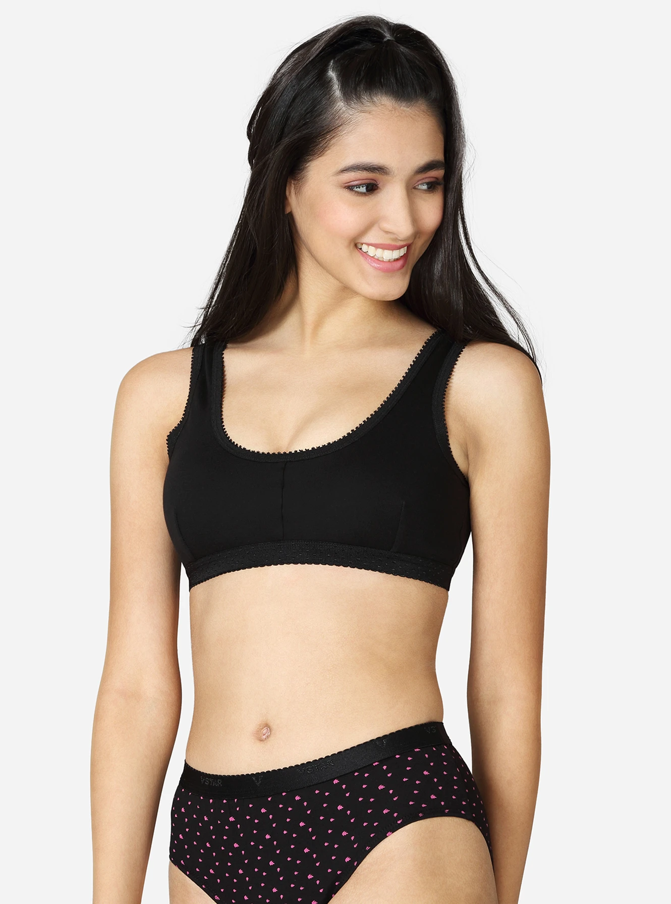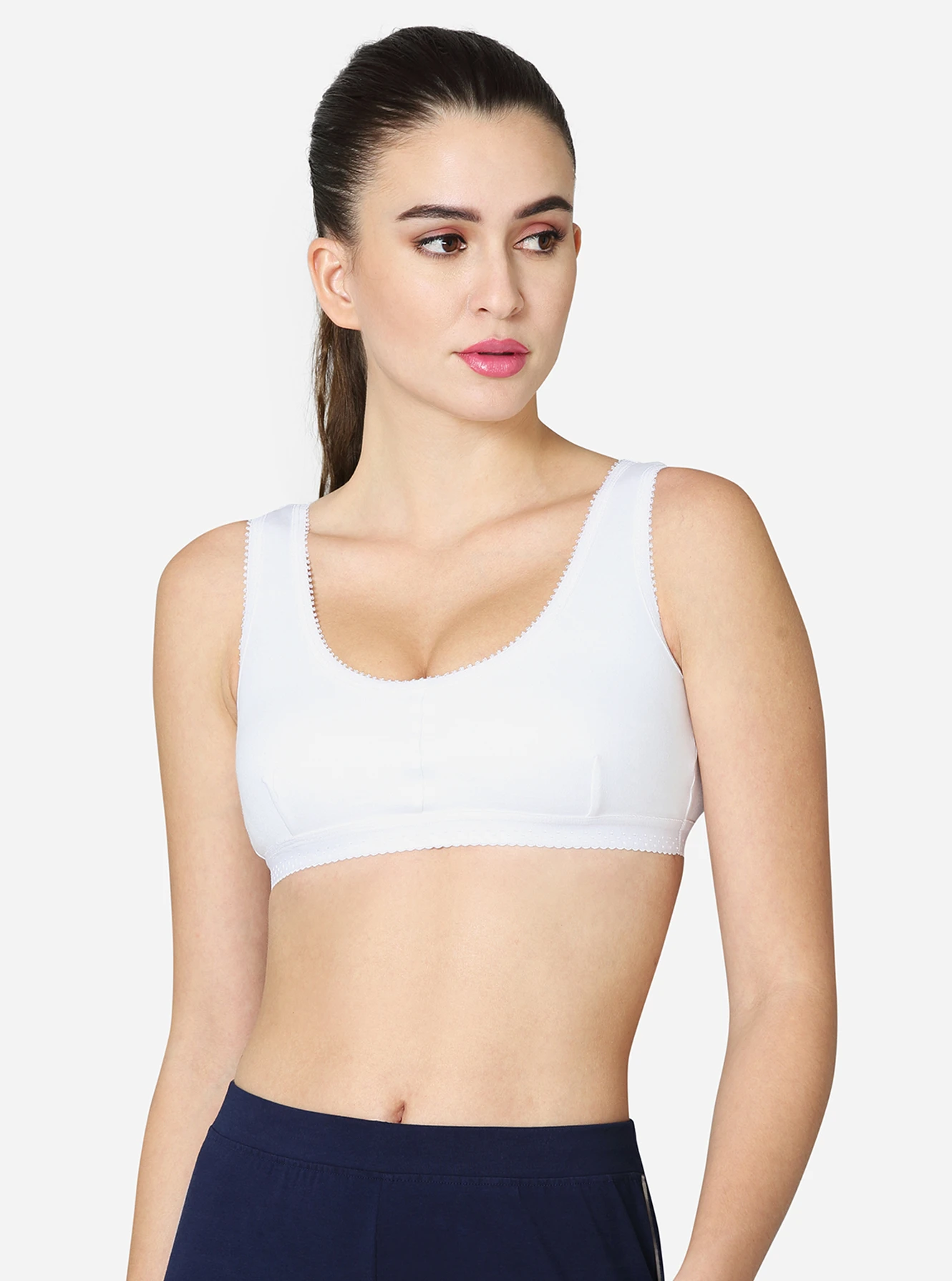 Made of 100% superior, soft combed cotton, providing excellent comfort. The double-layered, darted front panel provides maximum support. Seamed, non-padded with high coverage on the centre front. Soft, smooth, wide camisole-style strap.p No hooks or eyes attached for easy slip-on. Available in white skin & black colors