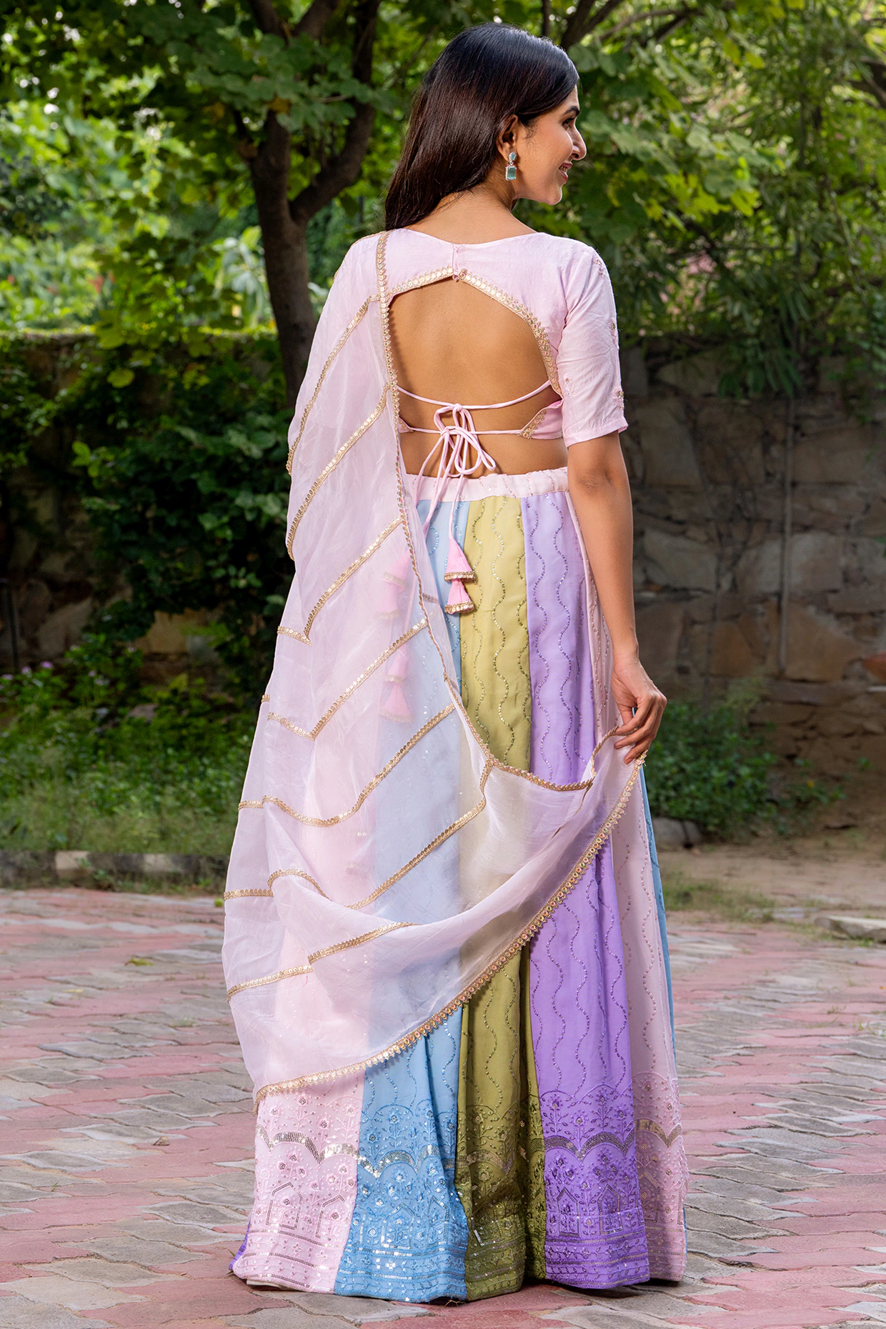 Featuring a multi-colored lehenga in a georgette base. It is paired with a pink embroidered blouse and an organza dupatta. Accentuate with chandbali earrings and heels for an engagement ceremony or a festive occasion.