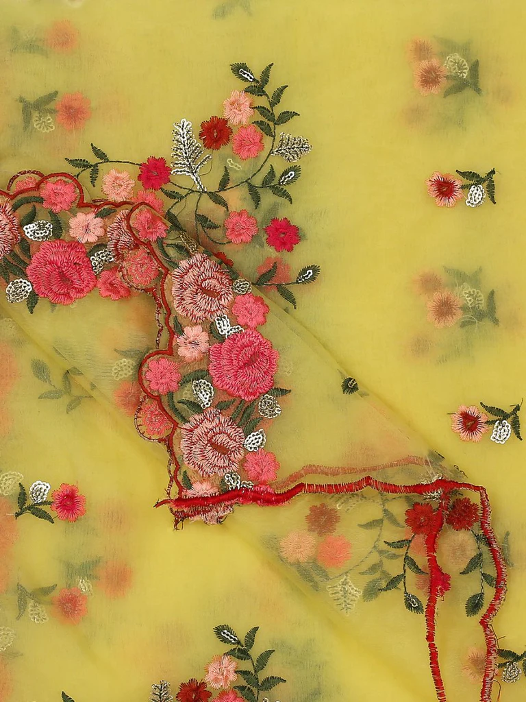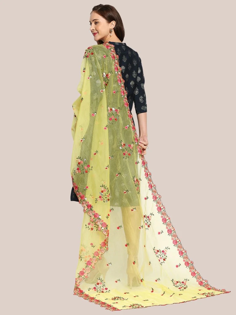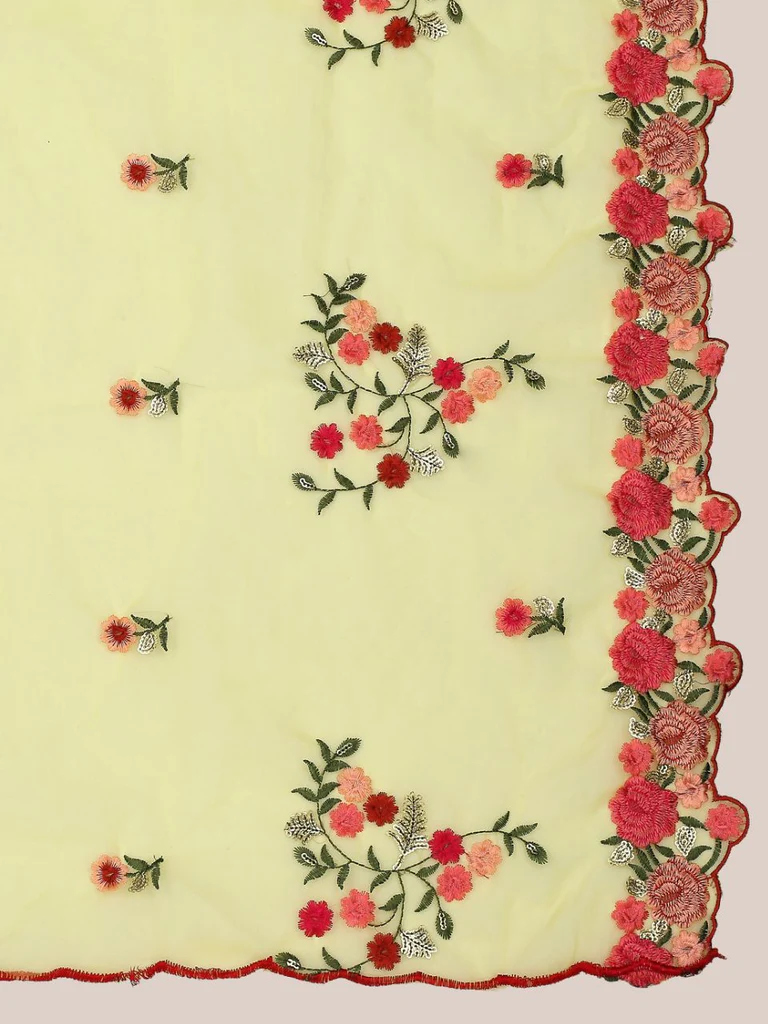 - This light weight organza dupatta is adorned with colorful embroidery all over along with scalloped borders .