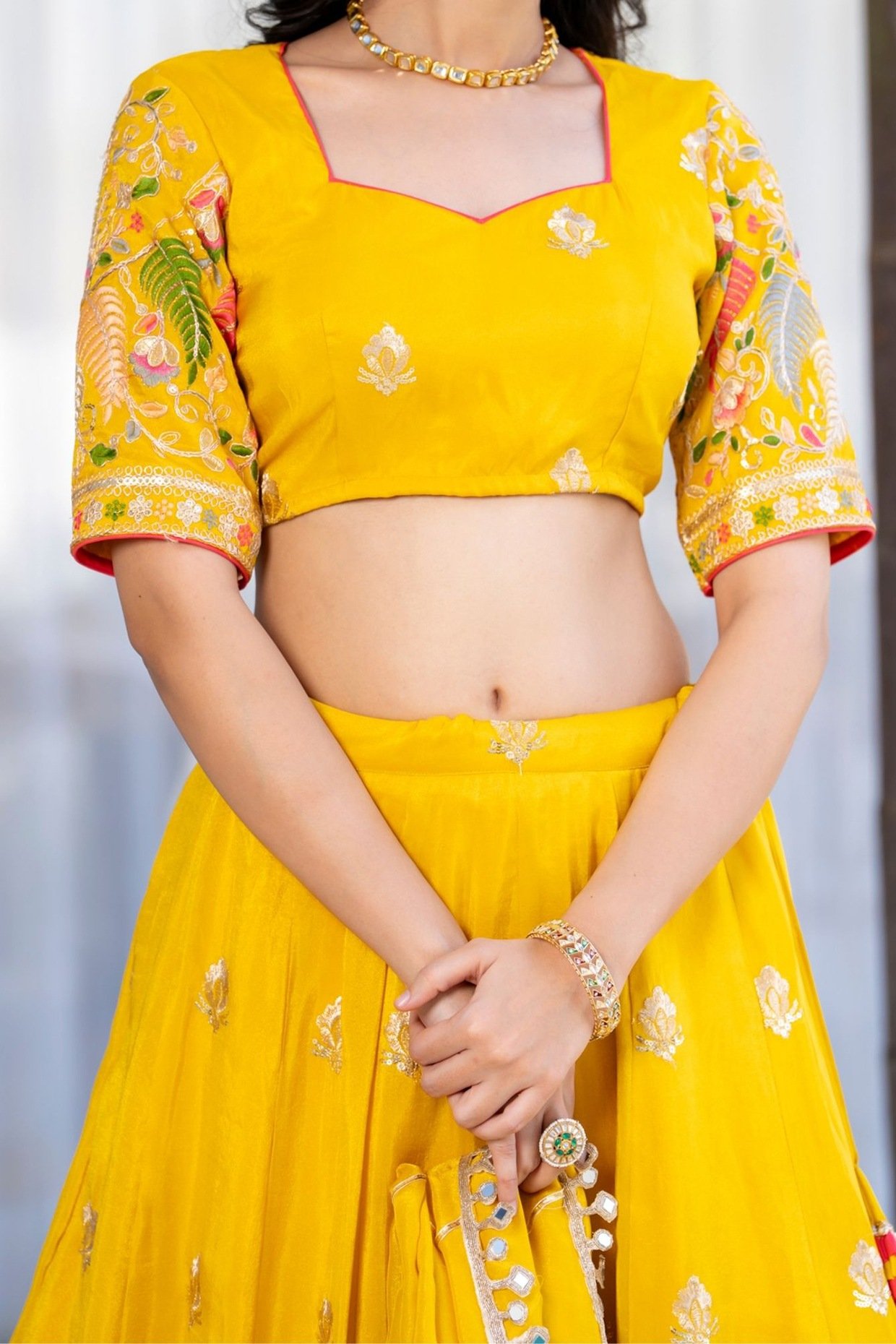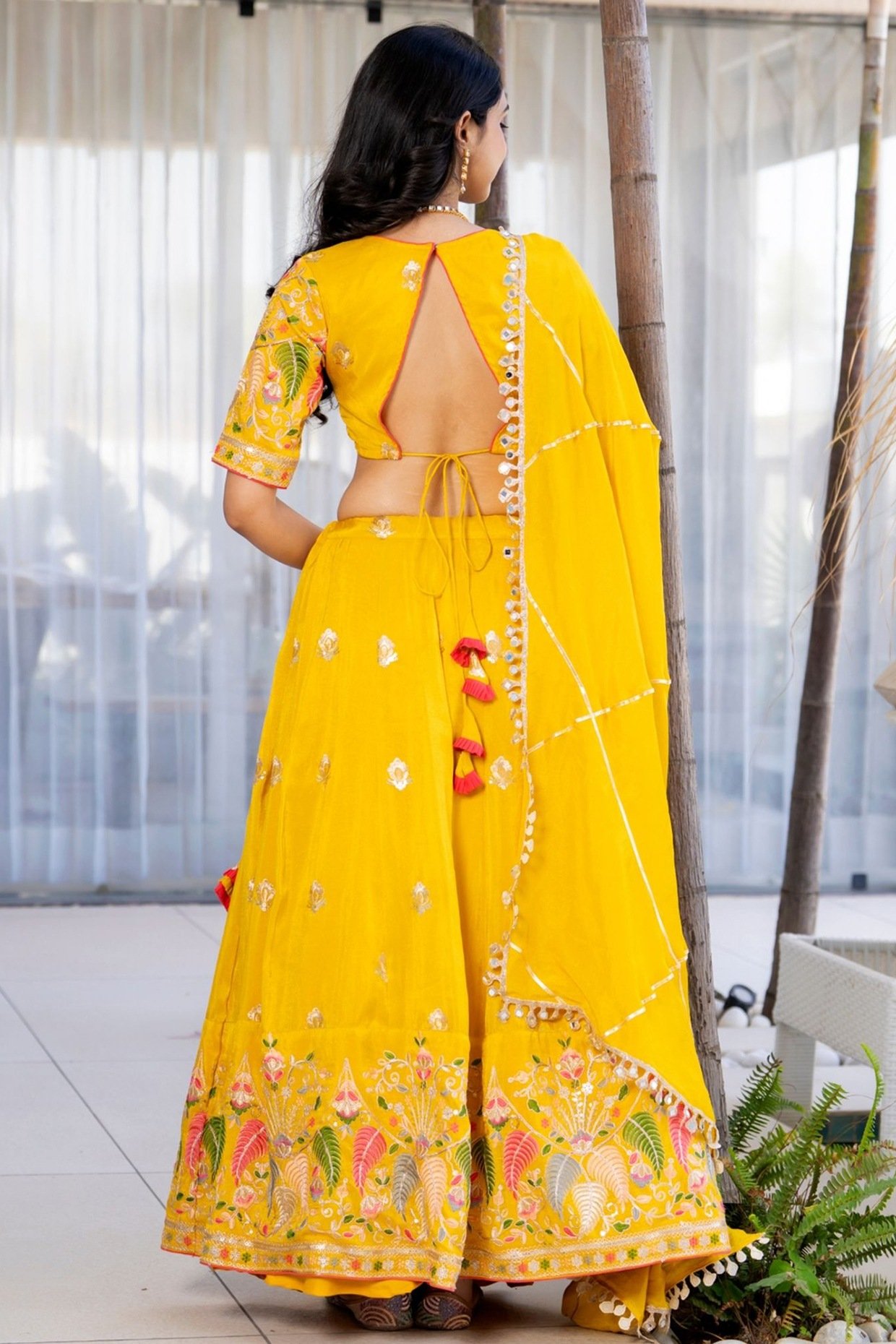 Featuring a yellow lehenga in tissue base with zari and floral embroidery, including tassels hanging. It is paired with a blouse and a dupatta. Accentuate it with dangler earrings and heels for festive occasions or wedding ceremonies.